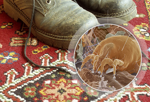 Как видите в пробах пыли можно обнаружить шерсть домашних животных, цветочную пыльцу, опасную плесень, и множество текстильных волокон от белья и одежды. Большое количество отшелушившихся чешуек кожи (с тела каждого из нас ежедневно отделяется около 50 миллионов таких чешуек, а если есть домашние животные - количество этих пылевых частиц намного увеличивается). Но самый неприятный компонент пыли – это микроскопические пылевые клещи размером от 100 до 300 микрон, которые питаются этими кожными чешуйками.