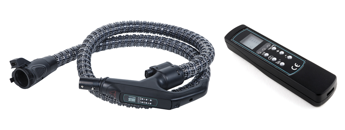 Дистанционное управление реализовано в виде съемного ИК пульта, который распологается на рукоятке и обеспечивает удобный контроль над функциями пылесоса. Прочный шланг армирован металлокордом из пружинной стали и покрыт двойным слоем каучука, в него интегрирован электрокабель питаня электрощетки.